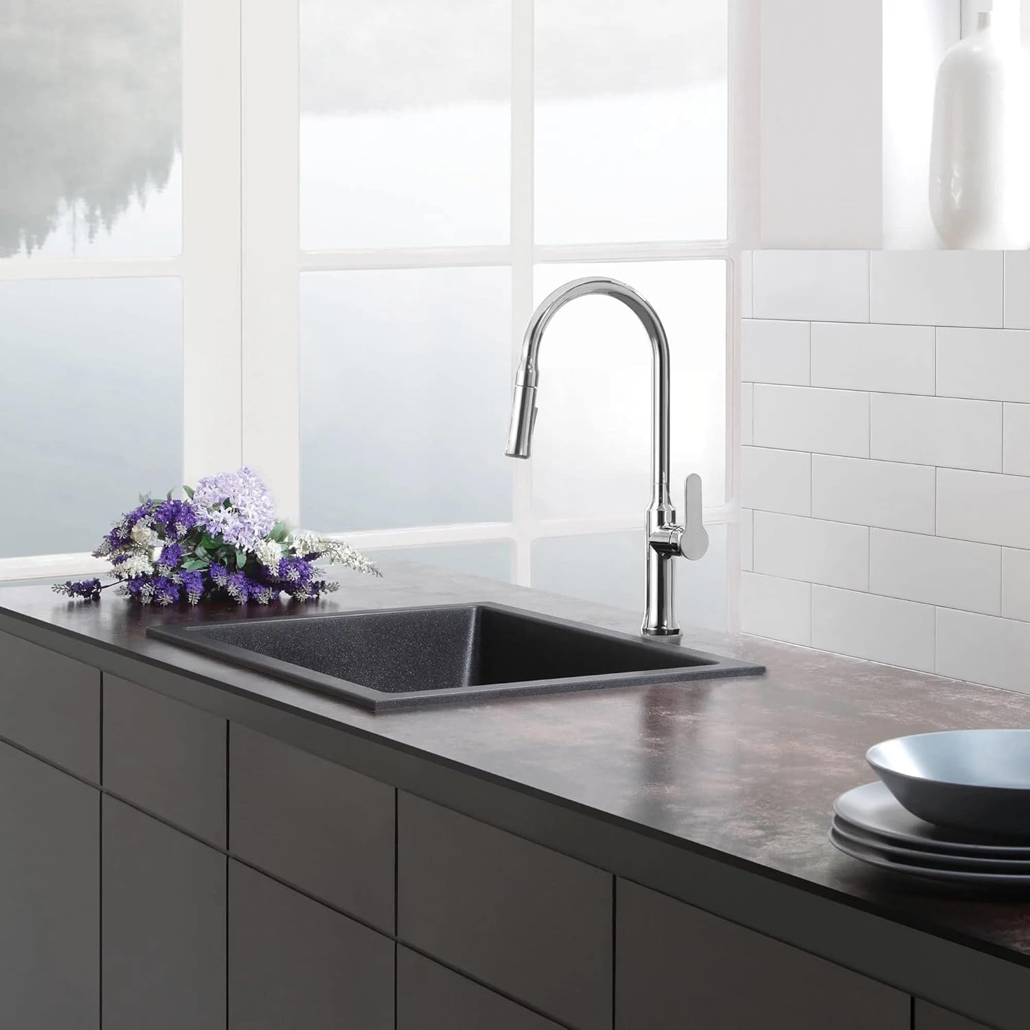 24" x 18" x 8.5" BLACK Matte Finish Granite/Quartz Single Bowl Kitchen Sink